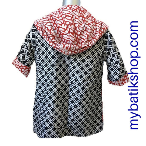 Cotton stamped modern hooded jacket defies the typical old-fashioned batik wear. It's one size fits S-L. This is a limited edition of Monchie Batik Indonesia.